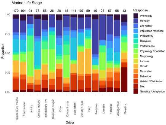 Proportion of papers within the marine life stage that compared each type of driver (x-axis) with each type of response (colors). The absolute number of papers represented in each column is provided at the top.