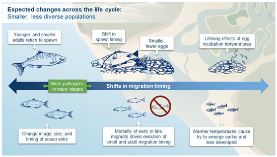 Smallmouth bass are expected to further invade the John Day River [153], and disease risks will likely increase for hatcheries in the upper Columbia [154]. The projection model for early salmon life history with the greatest geographic scope was developed by Beer and Anderson [155] for the whole western U.S. This model predicted higher rates of growth for fish in the coolest streams, but lower rates for fish in warmer streams in the Columbia Basin and California Central Valley leading to smaller sizes at marine entry and thus lower survival. Furthermore, steelhead were predicted to spawn earlier due to their spring spawning behavior, while fall-spawning Chinook are predicted to spawn later at many sites.