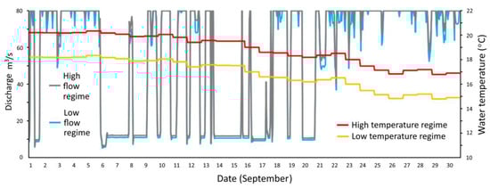 We used two temperature and two discharge time series in a 2 × 2 full factorial design. For the temperature time series, which represented the current temperature, we used modelled data based on air temperature for 2013–2014 []. The temperature model was validated by empirical water temperature data from 2019 to 2021. We used the temperature time series from 2013–2014 in our simulations because these years were not unusually warm or cold. To create the time series that represented an increased temperature regime, we used the first temperature time series and added 2 °C to all data points (Figure 1). In arctic rivers with ice dynamics, climate change will likely have less effect on winter water temperatures because these rivers will stay frozen []. However, in the Gullspång River, an increase can be expected because it is rarely ice covered and typically has winter water temperatures > 0 °C (SMHI’s Vattenwebb []), and it will likely be affected by a milder and wetter winter. The discharge time series that represented the current flow regime was based on data having a high temporal resolution (1 h−1) provided by the hydropower operator, and originating from years that were not unusually dry or wet (2013–2014). For the time series 1 September to 30 April, which represented a future flow regime in a climate with wetter winters, we used the first discharge time series and added a 10% discharge to all data points (Figure 1). We could not reliably estimate when conditions similar to those in our scenarios may occur. Nevertheless, as a comparison, modelling results from the Norwegian River Mandalselva (at approximately the same latitude as the Gullspång River) predict a substantially larger increase than 2 °C and 10% more discharge within 100 years [].