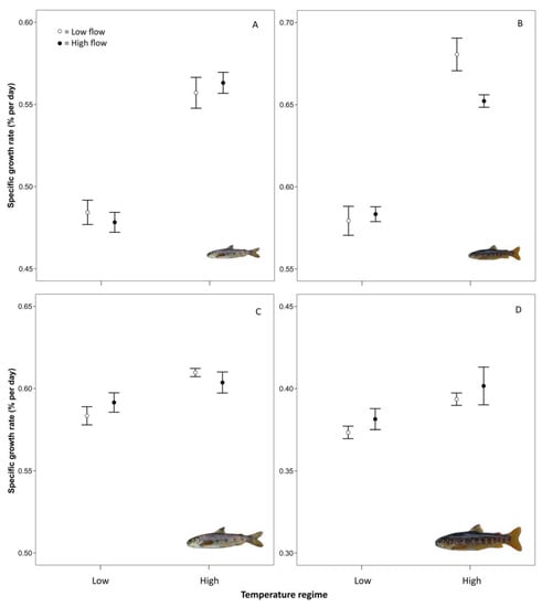 Mean specific growth rate (1 September–30 April) of (A) one-summer-old Atlantic salmon and (B) brown trout and (C) two-summer-old Atlantic salmon and (D) brown trout estimated from simulations (n = 5) of a Swedish hydropeaking river in low (baseline) and high (+2 °C increase from baseline) temperature regimes. Open circles represent a low (baseline), and filled circles a high (+10% from baseline) flow regime. The individual-based salmonid population model inSTREAM SD-7 was used for the simulations. Error bars indicate ± 1 SE.