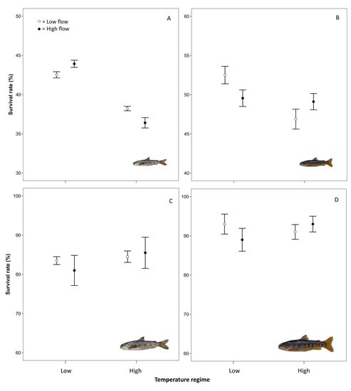 Mean survival rate (1 September–30 April) of (A) one-summer-old Atlantic salmon and (B) brown trout and (C) two-summer-old Atlantic salmon and (D) brown trout estimated from simulations (n = 5) of a Swedish hydropeaking river in low (baseline) and high (+2 °C increase from baseline) temperature regimes. Open circles represent a low (baseline) and filled circles a high (+ 10% from baseline) flow regime. The individual-based salmonid population model inSTREAM SD-7 was used for the simulations. Error bars indicate ± 1 SE.