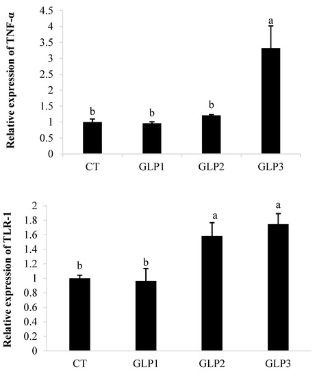 Tumor necrosis factor-α (TNF-α) and Toll-like receptor-1 (TLR-1) gene expression in zebrafish gastrointestinal tract. CT = control group; GLE1 = fish fed with 0.5 g kg−1 of Vitis vinifera leaf extract; GLE2 = fish fed with 1 g kg−1 of Vitis vinifera leaf extract; GLE3: fish fed with 2 g kg−1 of Vitis vinifera leaf extract. Bars assigned with different letters denote significant differences (p < 0.05).