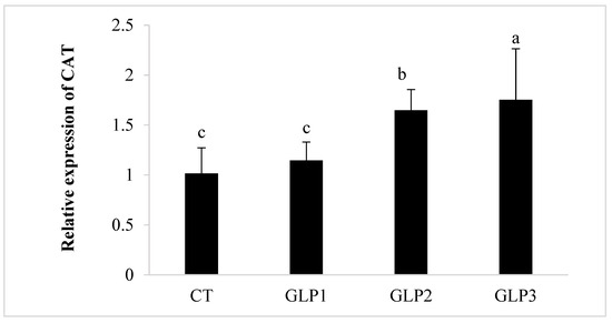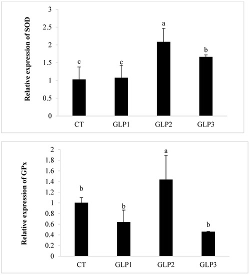 Catalase (CAT), Superoxide Dismutase (SOD), and Glutathione Peroxidase (GPx) gene expression in zebrafish gastrointestinal tract. CT = control group; GLE1 = fish fed with 0.5 g kg−1 of Vitis vinifera leaf extract; GLE2 = fish fed with 1 g kg−1 of Vitis vinifera leaf extract; GLE3 = fish fed with 2 g kg−1 of Vitis vinifera leaf extract. Bars assigned with different letters denote significant differences (p < 0.05).