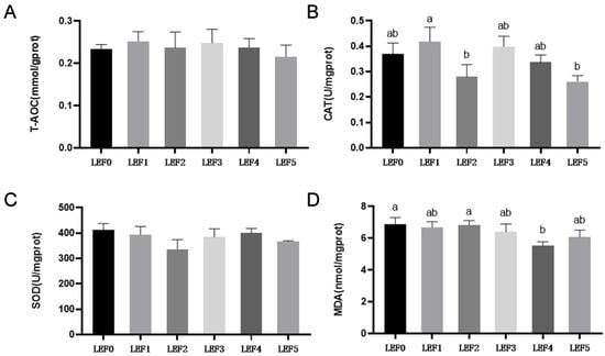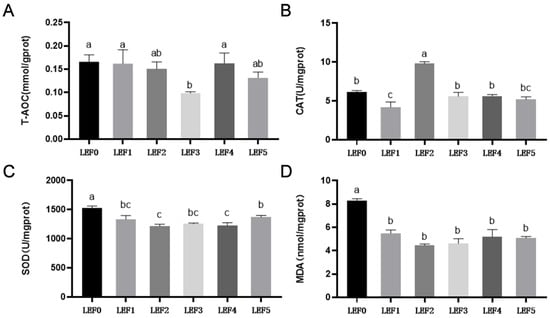 Effect of LEF on intestinal antioxidative activities of largemouth bass. Total antioxidant capacity (T-AOC, A), catalase (CAT, B), superoxide dismutase (SOD, C), malondialdehyde (MDA, D). Bars with different letters are significantly different (mean ± SD; ANOVA, p < 0.05; n = 4). LEF0 (0 g kg−1), LEF1 (10 g kg−1), LEF2 (20 g kg−1), LEF3 (30 g kg−1), LEF4 (40 g kg−1), LEF5 (50 g kg−1).