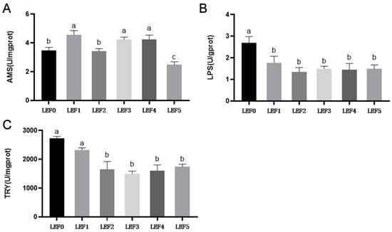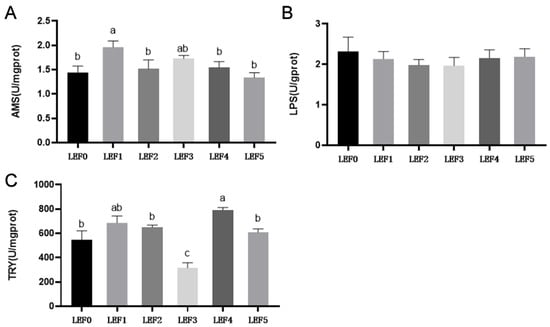 The liver AMS activity of the LEF1 group was considerably higher with the exception of the LEF3 group (p < 0.05). No discernible effect was found in the LPS activity of the liver among all treatments (p > 0.05). The LEF4 group had the highest trypsin activity, but there was no statistically significant difference in TRY activity between groups LEF0, LEF1, LEF2, LEF4 and LEF5 (p > 0.05, Figure 3).