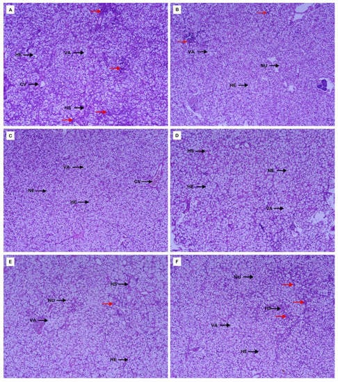 Effect of LEF on liver morphology of largemouth bass. (A): LEF0; (B): LEF1; (C): LEF2; (D): LEF3; (E): LEF4; (F): LEF5. (HE: hepatocytes; NU: nucleus; HS: hepatic sinusoid; CV: center vain; VA: vacuoles; Red Arrow: inflammatory infiltration). LEF0 (0 g kg−1, A), LEF1 (10 g kg−1, B), LEF2 (20 g kg−1, C), LEF3 (30 g kg−1, D), LEF4 (40 g kg−1, E), LEF5 (50 g kg−1, F).