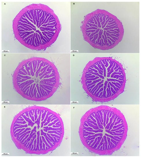 Effect of LEF on gut morphology of largemouth bass. LEF0 (0 g kg−1, A), LEF1 (10 g kg−1, B), LEF2 (20 g kg−1, C), LEF3 (30 g kg−1, D), LEF4 (40 g kg−1, E), LEF5 (50 g kg−1, F).