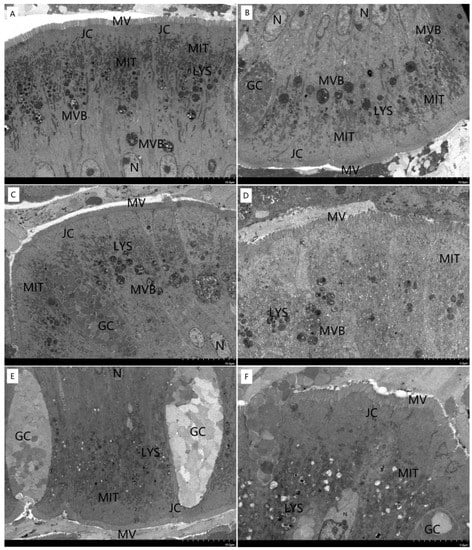 Ultrastection: the intestinal samples of fish in each replicate were cut into small pieces less than 1 mm3, fixed with 2.5% glutaraldehyde and 1% osmium tetroxide, dehydrated with gradient alcohol, embedded with resin, sliced with an ultrathin microtome, stained with uranyl acetate and lead citrate, observed and photographed with a transmission electron microscope.