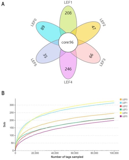The OTU VENN diagram visually showed the number of unique and common OTUs in each group. The number of OTUs in each group was 185, 304, 143, 162, 342 and 131, respectively. The total number of OTUs was highest in group LEF4. The rarefaction curve indicated that each sample had reached a sufficiently deep sampling depth (Figure 8). The α-diversity indexes were investigated to explore the bacterial community diversity of all groups (Table 4). The result showed that the microbial richness of group LEF4 significantly increased (p < 0.05), but there were no significant differences in Chao1, ACE, Shannon and Simpsons indices among all groups (p > 0.05).