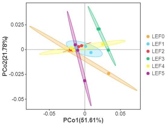 Principal coordinates analysis (PCoA) plots were generated from weighted-UniFrac distances to assess community composition (Figure 9). The contribution rates for the first and second principal components are 51.61% and 21.78%, respectively. The figure showed that there was no clear dissimilarity among groups LEF0, LEF1, LEF2, LEF4, LEF5, which meant that the composition of bacterial communities in these groups was similar. However, the samples of LEF3 were mainly centered in the first quadrants, while samples of other groups were near the second quadrant.
