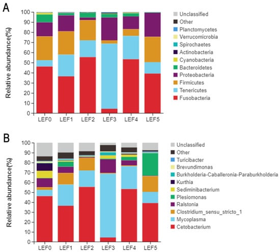 The OTUs were identified into 12 phyla. At the phylum level, Fusobacteria was the predominant microflora in group LEF0 (46.13%), LEF1 (36.43%), LEF2 (55.43%), LEF4 (53.31%), LEF5 (39.14%), followed by Tenericutes, Firmicutes, Proteobacteria, Bacteroidetes, while the predominant microflora of group LEF3 (64.25%) was Tenericutes (Table 5; Figure 10A). At the genus level, the percentage of Clostridium increased in groups LEF1, LEF2, LEF5, and the percentage of Cetobacterium also increased in groups LEF2, LEF4 (Figure 10B).
