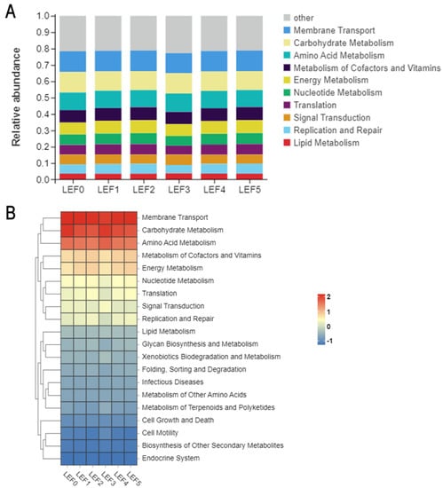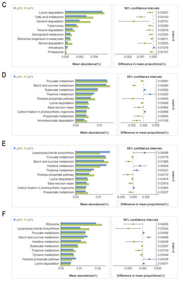 Tax4Fun functional prediction analysis showed that KEGG related to membrane transport, carbohydrate metabolism, amino acid metabolism, cofactor and vitamin metabolism, energy metabolism, nucleotide metabolism, signal transduction, transcription, replication and repair, and lipid metabolism were enriched in all treatments, and there was no significant difference between all groups (p > 0.05; Figure 11). Welch’s t-test, on the other hand, revealed that certain predicted pathways between LEF0, LEF1, LEF3 and LEF4 were significantly different (p < 0.05). Several predicted pathways were significantly enriched in the LEF3 group versus the LEF0 and LEF1 groups (p < 0.05). In KEGG level 3 analysis, lysine degradation, fatty acid metabolism, geraniol degradation, tuberculosis and toluene degradation were significantly more abundant in group LEF3 compared with LEF0 (p < 0.05; Figure 11C); pyruvate metabolism, starch and sucrose metabolism and pentose phosphate pathway were more abundant in group LEF3 (p < 0.05; Figure 11D), while butanoate metabolism, thiamine metabolism enriched in group LEF1; pyruvate metabolism, starch and sucrose metabolism, lipopolysaccharide biosynthesis, thiamine metabolism enriched in group LEF2, while histidine metabolism, pyruvate metabolism, starch and sucrose metabolism were more abundant in group LEF3 (p < 0.05; Figure 11E); ribosome, lipopolysaccharide biosynthesis, histidine metabolism are more abundant in group LEF5 (p < 0.05; Figure 11F).