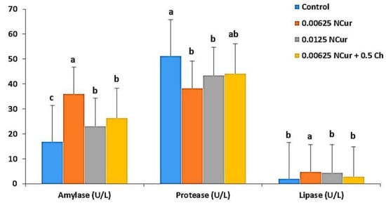 A diet of 0.00625 g NCur/kg showed the highest significant amylase enzyme activity values. However, protease activity did not improve in the supplemented groups over the control, and lipase activity did not reveal significant (p < 0.05) differences (Figure 1).