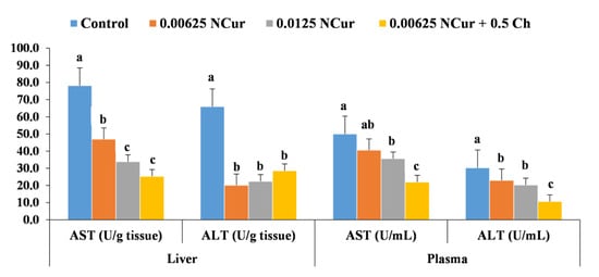The levels of ALT and AST significantly (p < 0.05) decreased in the NCur- and NCur/Ch-supplemented groups compared with the control. The lowest (p < 0.05) levels of ALT and AST in plasma samples were detected for the group receiving 0.00625 + 0.5 NCur/Ch g/kg diet (10.6 ± 0.002 and 22 ± 0.001). The lowest (p < 0.05) levels of ALT and AST in liver samples were detected for both NCur 0.0125 (22.4 ± 0.002 and 33.9 ± 0.005) and NCur/Ch 0.00625 + 0.5 groups (28.3 ± 0.002 and 25.3 ± 0.002) (Figure 3).