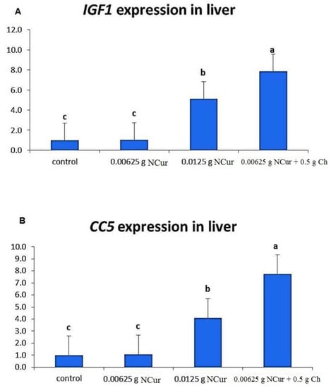 The groups that received NCur and NCur/Ch supplemented diets displayed (p < 0.05) noticeable upregulation in the expression pattern of both igf-1 and cc5 genes, with the most marked increase, compared to the control, in the NCur/Ch 0.00625 + 0.5 group (Figure 5).