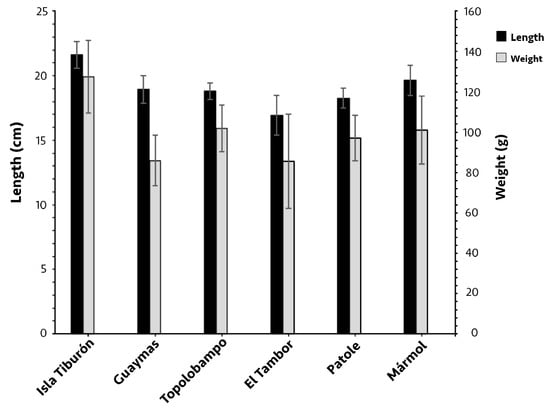 Of the 257 individuals of O. libertate analyzed, 166 were females, and 91 were males. The mean fork length and body weight significantly varied between some localities (p < 0.05; Figure 2), with both weight and length being notably higher at Isla Tiburón—21.6 ± 1 cm and 127 ± 18 g, respectively—compared to all other localities (p < 0.05), and the smallest fish were located in El Tambor; in this locality, while the fork length was significantly smaller (16.9 ± 1.5 cm) than in all the other localities, the body weight (85.5 ± 23.4 g) only differed from Isla Tiburón, Topolobampo, and Mármol. There was no significant difference in length between the females and males in each locality (p > 0.05); the weight of females in Topolobampo (104.2 g) was significantly higher than the males (89.4 g; p < 0.05).