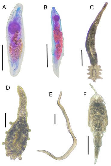 - Marcogliese, D.J. The role of zooplankton in the transmission of helminth parasites to fish. Rev. Fish Biol. Fish. 1995, 5, 336–371. [Google Scholar] [CrossRef]