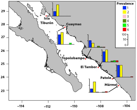 Regarding locality distribution, the significant prevalence and median intensity of digeneans were recorded in El Tambor and Patole (Table 2 and Figure 4 and Figure 5). The prevalence of P. merus was 100% in El Tambor, which was significantly higher (p < 0.05) than in Isla Tiburón, Topolobampo, and Mármol. This was followed by P. merus with 96% prevalence in Patole, which was significantly higher (p < 0.05) than Topolobampo and Mármol. In contrast, the prevalence of P. merus was significantly lower (33%, p < 0.05) in Topolobampo compared to all other localities. Moreover, the median intensity of P. merus was also significantly higher in Patole (20 parasites/fish, p < 0.05) than in all other localities, except for El Tambor, while significantly lower in Topolobampo (3 parasites/fish, p < 0.05) than all other localities, except for Isla Tiburón.