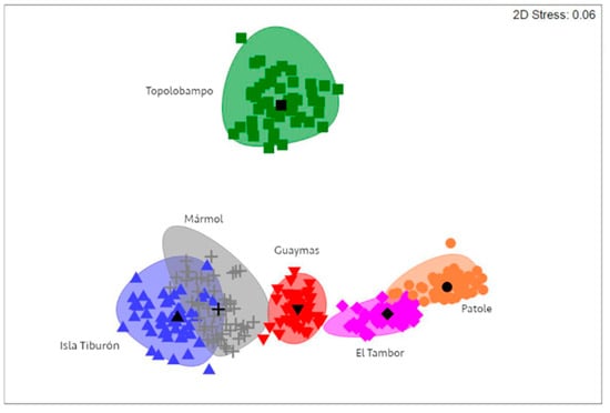 A Bray–Curtis similarity matrix was computed for the intensity of P. merus and M. ecaude infection, followed by bootstrap-average-based nMDS ordination generation, which showed an apparent separation between some sampling localities, with clear separation observed for Topolobampo, in addition to El Tambor and Patole separated from Isla Tiburón, Guaymas, and Mármol (Figure 6). According to the PERMANOVA, there was significant variability in the intensity of P. merus and M. ecaude infection between localities (Table 3). Furthermore, pairwise tests indicated significant differences in all cases (Pperm < 0.01), except between Isla Tiburón and Mármol and between El Tambor and Patole (Pperm > 0.05).