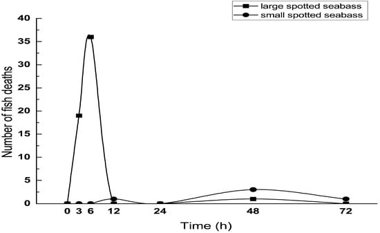 Figure 1 depicts the death situation of various sizes of seabass after 72 h of heat stress (32 °C). The mortality of the large spotted seabass group was higher than that of the small spotted seabass group. In the large spotted seabass group, 19 (15.8%) and 36 (30%) died rapidly at 3 h and 6 h after heat stress, respectively. In the small spotted seabass group, one (0.8%) died at 12 h and 72 h after heat stress, and three died at 48 h (2.5%) after heat stress.