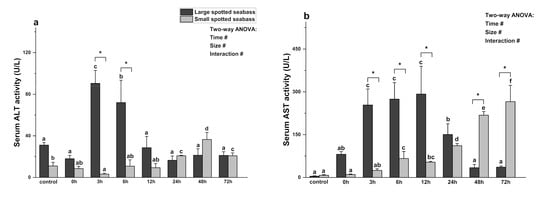 ALT and AST are secreted and expressed by the liver and are usually released into the blood in small amounts []. Previous studies on puffer fish Takifugu obscurus and Wuchang bream Megalobrama amblycephala Yih showed that the activities of ALT and AST were increased sharply after heat stress, and the liver was damaged [,]. In this study, the levels of ALT and AST in large spotted seabass increased significantly at 3–12 h, whereas those in small spotted seabass increased significantly at 24–72 h. The results indicated that large spotted seabass exhibit severe liver damage within 6 h, while small spotted seabass show similar damage after 24 h.