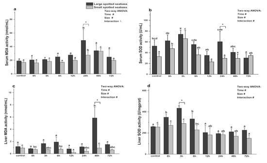 Changes in serum MDA (a), serum SOD (b), liver MDA (c), and liver SOD (d) activities during heat stress in different sizes of L. maculatus (with average weights of 57.91 ± 11.57 g and 13.92 ± 2.77 g, respectively). Different lowercase letters (a, b, c, d, e or f) denote statistically significant differences among the various heat stress times (Duncan’s test, p < 0.05). The symbol “*” indicates significant differences (t-test, p < 0.05) among the different sizes of L. maculatus at the sampling time. The symbol “#” indicates that the size or time or their interaction has a significant effect on the parameter (two-way ANOVA, p < 0.05). The symbol “\” indicates that the size or time or their interaction has no significant effect on the parameter (two-way ANOVA, p < 0.05). Data are presented as mean ± deviation (n = 4).