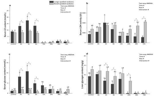 Changes in serum LD (a), serum LDH (b), serum glucose (c), and liver glycogen (d) during heat stress in different sizes of L. maculatus (with average weights of 57.91 ± 11.57 g and 13.92 ± 2.77 g, respectively). Different lowercase letters (a, b, c, d, or e) denote statistically significant differences among the various heat stress times (Duncan’s test, p < 0.05). The symbol “*” indicates significant differences (t-test, p < 0.05) among the different sizes of L. maculatus at the sampling time. The symbol “#” indicates that the size or time or their interaction has a significant effect on the parameter (two-way ANOVA, p < 0.05). Data are presented as mean ± deviation (n = 4).