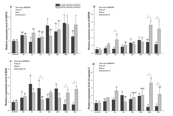 Under the same heat stress time and different sizes, the HSP70 mRNA level of large spotted seabass was higher than that of small spotted seabass at 0 h, 12 h, and 48 h of heat stress. Except for 12 h and 24 h, the HSP90 mRNA level of small spotted seabass was higher than that of seabass, and the difference was significant at 3, 48, and 72 h (p < 0.05). The BAX mRNA level in large spotted seabass was higher than that of small spotted seabass at 3, 6, and 24 h of heat stress (p <0.05), and was lower than that of small spotted seabass at other time points, and was significantly different at 48 h and 72 h (p < 0.05). The level of caspase-3 mRNA in large spotted seabass was higher than that in small spotted seabass at 6 h of heat stress, and lower than that in small spotted seabass at other time points, and the difference was significant at 48 h and 72 h (p < 0.05).