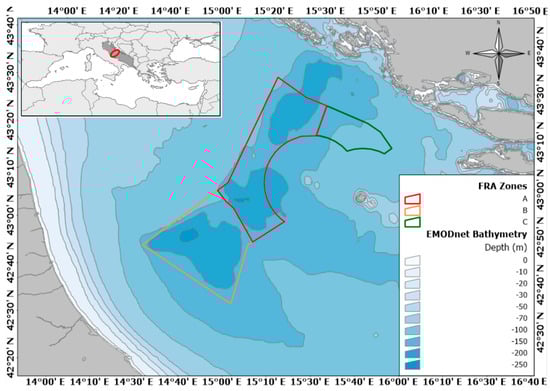 The location of the study area within the Mediterranean basin is indicated by a red circle in the top-left rectangle; the main map shows the bathymetry of the Central Adriatic Sea (source: [39]) and the Jabuka/Pomo Pits Fishery Restricted Area zones “A”, “B”, and “C”, according to Recommendation GFCM/41/2017/3 [48].