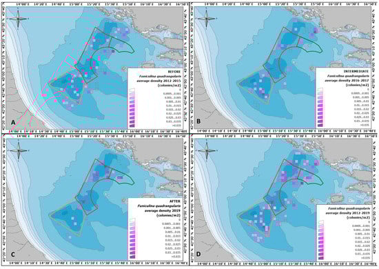 Map of the study area: the polygons indicate the three zones of the FRA, the 2 × 2 nautical mile cells coloured with a purple palette indicate the average density of F. quadrangularis colonies (no colonies were ever recorded in the empty cells); panels (A–C) refer respectively to periods “BEFORE”, ”INTERMEDIATE”, and ”AFTER”, while panel (D) shows values calculated per each cell over the entire time frame of the study (2012–2019).