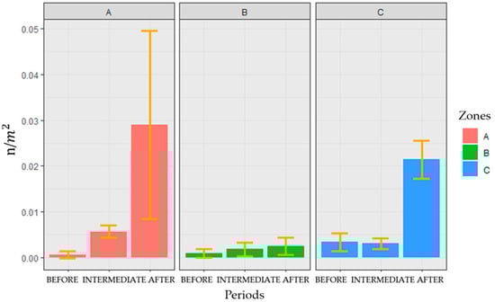 Average densities (n/m2) of F. quadrangularis colonies recorded in the three FRA zones (“A”, “B”, “C”) for the three considered periods (“BEFORE”, “INTERMEDIATE”, “AFTER”); yellow bars indicate the standard deviation.