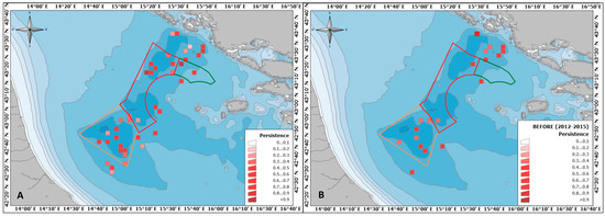 The persistence index, calculated for each cell within the entire study area across the entire time frame of the study (Figure 6A), showed the highest values (>0.9) in zones “A” and “C”. The minimum value of persistence was recorded in Croatian territorial waters (=0.166), whereas the maximum value was found in zone “A” (=1). The persistence index calculated in each cell for the “BEFORE” period is shown in Figure 6B. The lowest recorded value (=0.333) in this case was in zone “B”; the highest was in Croatian territorial waters (=1).