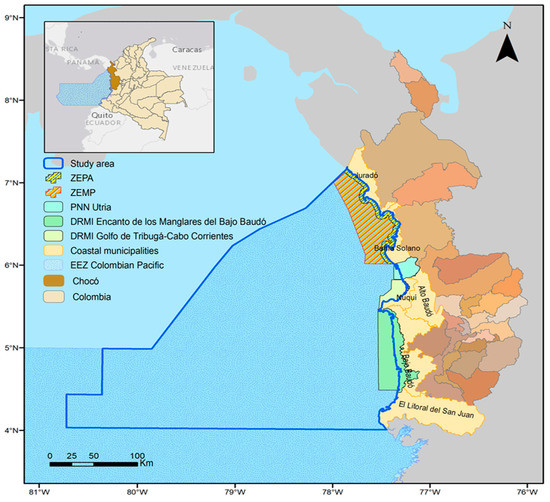 The study area extends along the 748 km of the Pacific coast of the department of Chocó, forming a polygon of 79.5 km2, from the coastline to the furthest point offshore, reaching a length of 202 nautical miles (Figure 1). This area includes the municipalities of Juradó, Bahía Solano, Nuquí, Bajo Baudó, and El Litoral del San Juan, all of which are home to artisanal fishing activities that contribute to the economic livelihood and food security of coastal households in the region [44].