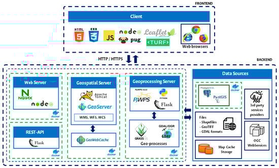 - Architecture and functionalities: The architecture was structured with open-source components to ensure transparent interoperability with other open and commercial systems. Backend and front-end functionalities were determined (Figure 2), utilizing open-source tools such as PostGIS, PostgreSQL, LeafletJS, Node.js, and Geoserver, as well as a framework and Docker for rapid application deployment and system security.