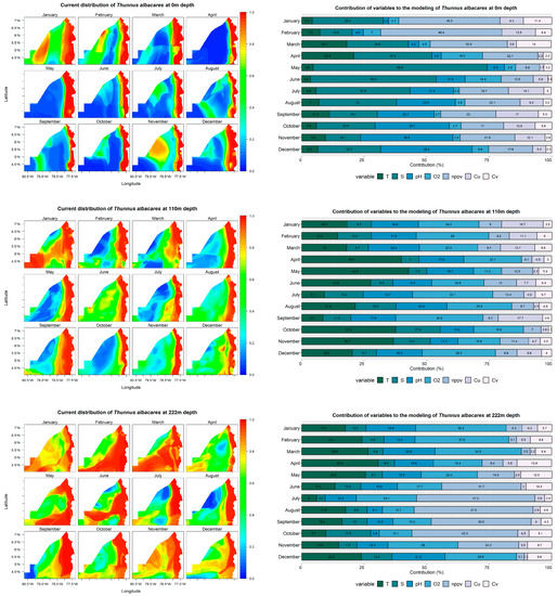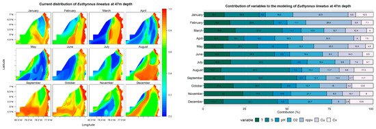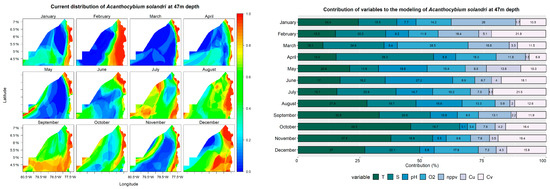 At a depth of 47 m, A. solandri exhibits a high probability of occurrence (>60%) both in a strip parallel to the coastal zone and in oceanic water areas from May to December. However, these values are concentrated in strips parallel to the coastal zone from January to April. The most significant variables contributing to the models at this depth were temperature and salinity, with their contributions exceeding 10% in all months. Additionally, other variables had contributions greater than 10% in some months (Figure 4).
