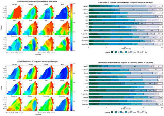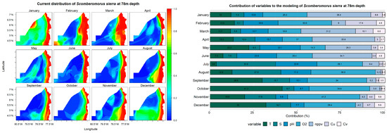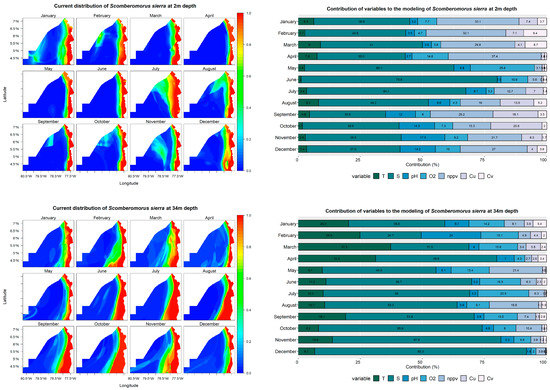 The distribution models constructed for Scomberomorus sierra at a depth of 2 m reveal that the species primarily inhabits the coastal zone, where the probability of occurrence is 100%. Only in January and February can areas with higher probabilities (>40%) be observed farther from the coast (Figure 5). Net primary production, which contributes between 29% and 33% in the first four months of the year, is the second most significant contributing variable, ranging between 30% and 64% across all months. Moreover, the pH variable contributed more than 10% in the last four months of the year, and V currents presented contributions of more than 10% in August, September, and October (Figure 5).