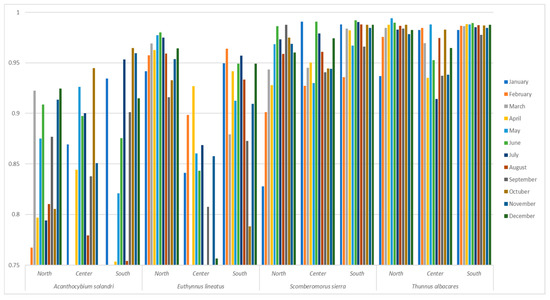 Figure 3 illustrates the performances of the ensemble models evaluated through cross-validation. The models for Acanthocybium solandri, Scomberomorus sierra, and Euthynnus lineatus yielded results above 0.9 (red horizontal reference line) across all months and depths for each species. In contrast, some assembly models built for Thunnus albacares displayed yields between 0.8 and 0.9, particularly at the third depth of 222 m. This decrease for the Thunnus albacares assemblage—compared to the other species—may be attributed to the number of occurrence records used as input data [75,76], and other factors potentially influencing the species’ geographic range and environmental tolerance [77].