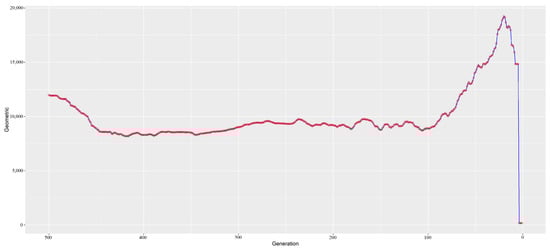 Estimates of the effective population size (Ne) were implemented in the GONE software by using the SNP genotypes [], and the GONE program was run with the following parameters: “PHASE = 2, cMMb = 1, DIST = 2”; other parameters were set to their default values. This included an unknown phase, an average rate of recombination of 0.01 cm/Mb, and genetic distance correction based on Haldane’s function.