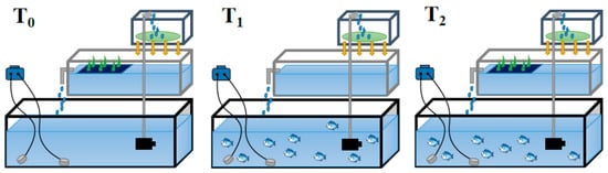 The three experimental groups: (T0) water–vegetable group; (T1) water–fish group; (T2) fish–vegetable group.