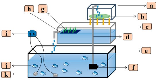 Hydroponics unit in the test: (a) filter box; (b) biochemical filter cotton; (c) plant bed; (d) water inlet pipe; (e) aquaculture tank; (f) suction pump; (g) lettuce; (h) floating foam board; (i) air pump; (j) crucian carp; (k) air stone.