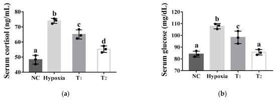 Stress parameters of crucian carp in NC, hypoxia, T1 and T2 groups: (a) cortisol; (b) serum glucose. Results are expressed as means ± SDs (n = 9), and different letters indicate significant differences (p < 0.05).