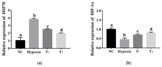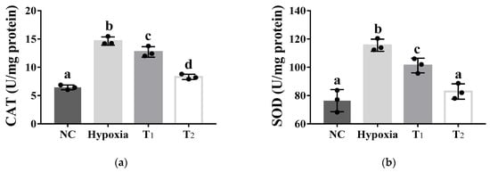 Antioxidant parameters of crucian carp in the NC, hypoxia, T1 and T2 groups were studied: (a) CAT; (b) SOD. Results are expressed as means ± SDs (n = 9), and different letters indicate significant differences (p < 0.05).