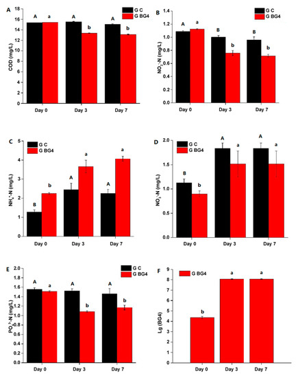 The COD in the BG4 group on day 7 was 15.2%, decreasing from 15.44 to 13.09 mg/L (p < 0.05, Figure 1A). The NO2−−N concentration decreased from 1.12 to 0.72 mg/L, and the degradation rate on day 7 was 36.3% (p < 0.05, Figure 1B). The NO3−−N degradation rate was 17.4% compared with that of the control group on day 7 (Figure 1D). The PO43−−P concentration decreased from 1.51 mg/L to 1.09 and 1.17 mg/L on days 3 and 7, respectively, with a degradation rate of 28.9% and 22.5%, respectively (p < 0.05, Figure 1E). The quantity of bacteria in the BG4 group increased from 2 × 104 CFU/mL on day 0 to 1 × 108 CFU/mL on days 3 and 7 (Figure 1F).