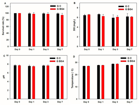 The BG4 and control groups were set up as three parallel replicates; in the BG4 group, BG4 was added to the sterilized aquaculture water according to the specified bacterial quantity (5 × 104 CFU/mL) in the product description. In the control group, normal saline was added to the same volume as the treatment mixture used in the BG4.
