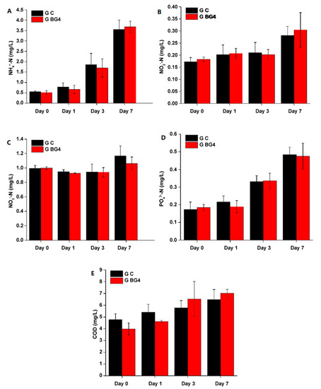The concentrations of N and P forms in the water of both BG4 and control groups showed an upward trend, which could be attributed to the addition of feed over the course of the 7 days. During the experiment, the NH4+−N (Figure 3A), NO2−−N (Figure 3B), NO3−−N (Figure 3C), PO43−−P (Figure 3D), and COD (Figure 3E) concentrations did not significantly differ between the two groups (p > 0.05).