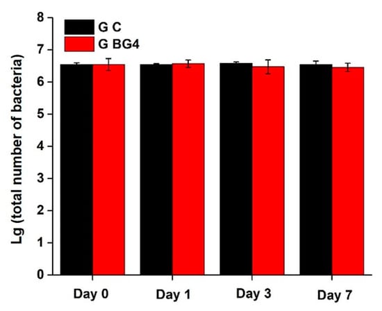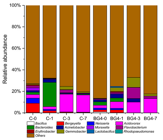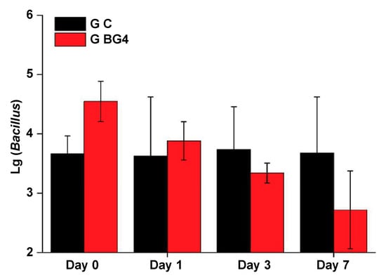 Twelve dominant bacterial genera were detected: Bacillus, Bergeyella, Neisseria, Acidovorax, Bacteroides, Acinetobacter, Moraxella, Flavobacterium, Erythrobacter, Gemmobacter, Lactobacillus, and Rhodopseudomonas. On day 0, the average proportion of Bacillus was 1.01% in the BG4 group (Figure 6), which was significantly higher than that in the control group (p < 0.05). The average proportion of Bergeyella was significantly higher in the BG4 group than in the control group (p < 0.05), and the average proportions of Moraxella and Flavobacterium in the BG4 group were significantly lower than those in the control group (p < 0.05). On day 1, the average proportion of Bacillus was 0.21% in the BG4 group (Figure 6), which was not significantly different from that in the control group (p < 0.05). In the BG4 group, the relative abundance of Acidovorax, Erythrobacter, Flavobacterium, and Gemmobacter was significantly higher than the corresponding values in the control group (p < 0.05). On day 3, the average proportion of Bacillus was 0.07% in the BG4 group (Figure 6), which was significantly lower than that in the control group (p < 0.05). The relative abundance of both Flavobacterium and Gemmobacter in the BG4 group was significantly higher than that in the control group (p < 0.05), and the average proportion of Bergeyella was significantly lower in the BG4 group than in the control group (p < 0.05). On day 7, the average proportion of Bacillus was 0.02% in the BG4 group (Figure 6), which was significantly lower than that in the control group (p < 0.05). Similarly, the relative abundance of Acinetobacter was significantly lower in the BG4 group than in the control group (p < 0.05); however, the average proportion of Flavobacterium was significantly higher in the BG4 group than in the control group (p < 0.05).