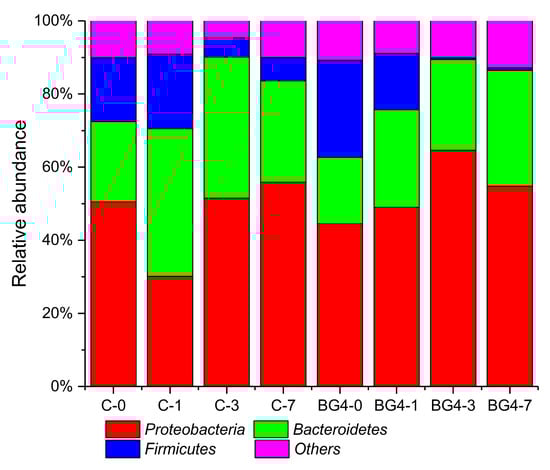 Changes in the composition of the bacterial communities in the BG4 and control groups during the experiment were analyzed using high-throughput sequencing. At the beginning of the experiment, the dominant bacteria in the two groups were members of the phyla Proteobacteria, Bacteroidetes, and Firmicutes, which, in the control group, represented 50.48%, 21.98%, and 17.44%, respectively, of the bacteria. In the BG4 group, the relative abundance of these phyla were 44.46%, 18.19%, and 26.60%, respectively (Figure 5). On experimental day 1, the proportion of bacteria in Proteobacteria, Bacteroides, and Firmicutes was 30.11%, 40.41%, and 20.36% in the control group and 49.02%, 26.62%, and 15.45% in the BG4 group, respectively. On day 3, the corresponding proportions were 51.50%, 38.59%, and 5.25% in the control group and 64.58%, 24.83%, and 0.47% in the BG4 group. In the BG4 group, the relative abundance of Firmicutes was lower than that in the control group (p < 0.05). On day 7, Proteobacteria, Bacteroides, and Firmicutes represented 55.88%, 27.68%, and 6.40% of all bacteria in the control group and 54.75%, 31.76%, and 0.65% in the BG4 group. The percentage of bacteria in the BG4 group that were members of phylum Firmicutes was less than the corresponding portion in the control group (p < 0.05).