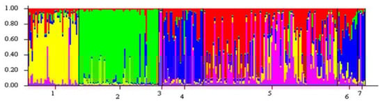 - Pritchard, J.K.; Stephens, M.; Donnelly, P. Inference of population structure using multilocus genotype data. Genetics 2000, 155, 945–959. [Google Scholar] [CrossRef] [PubMed]