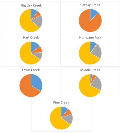 In the summer of 2017, we sampled fish located in seven streams (Figure 2) known to be inhabited by Clinch Dace [9] using three-pass pulsed-DC electrofishing. Sample sites and sizes were Big Creek (n = 106), Greasy Creek (n = 6), Hart Creek, (n = 63), Hurricane Creek (n = 40), Lewis Creek (n = 3), Middle Creek (n = 11), and Pine Creek (n = 32). A small fin-clip was cut from the upper caudal fin of Clinch Dace and stored in 95% ethanol. Fin-clips were given a unique identifier that corresponded to stream, reach, and fish length, and, in some cases, a photograph was taken. Any Clinch Dace that died during sampling were preserved in 10% formalin. All fish sampling was performed in accordance with Virginia Tech IACUC protocol FWC 16-188 and approved on 1 November 2016.