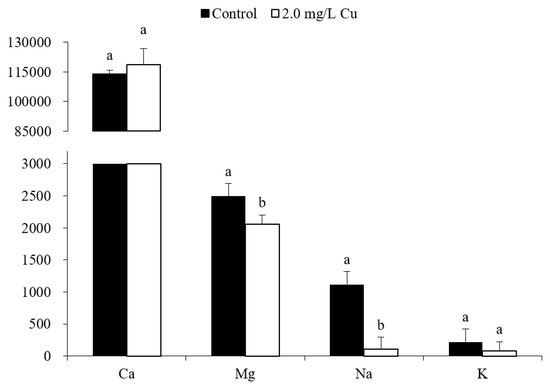 Ion concentrations in the gills of Anodonta woodiana from the control and Cu-treated groups. Data are presented as mean ± SD of three parallel measurements. Values with different letters indicate a significant difference (t-test, p < 0.05) between the control and Cu-treated groups.